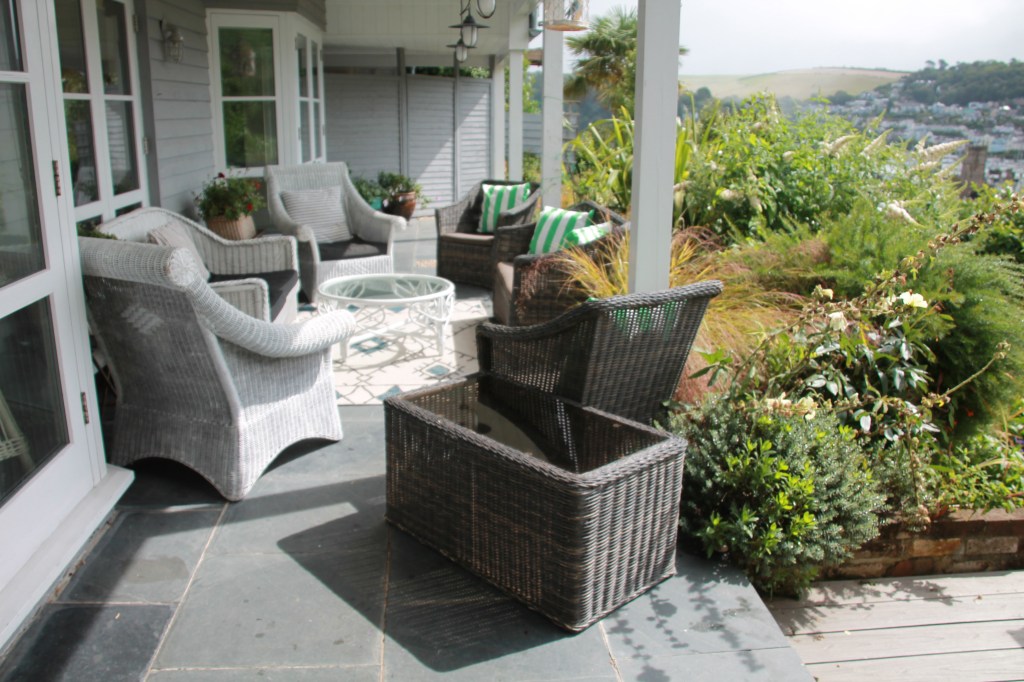 French doors open from the communal areas to a large balcony with outdoor table and chairs plus settees ….and of course wonderful views!